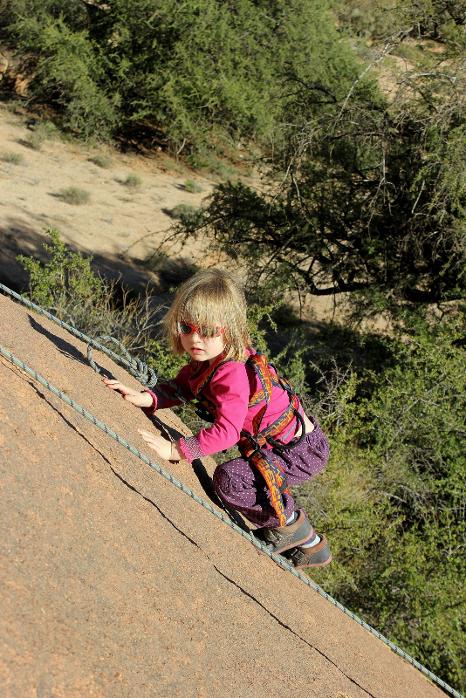 Left: Granite slabs are perfect for the little ones, as there are no reach issues here! Lydia (aged 4) on Rainbow Girl in the Awmrkt Valley.