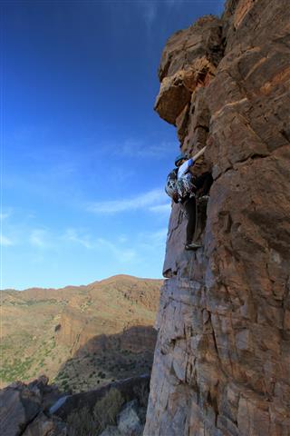 B) The Upper Crag via the Angel's Crest - from the col at the foot of the Upper Crag a terrace leads out horizontally leftward across the face. Follow this to it's end, from where the next 'route' climbs straight upwards. The climbing is mostly about Difficult in standard, though plenty of variations are available. Although the climbing is very easy, there is considerable exposure and a rope is advised. The climbing only lasts about 160m or so, until walking and scrambling lead to the summit of the Upper Crag. Continue walking over this until the striking pyramid-like summit of Jebel el Kest comes into view ahead.